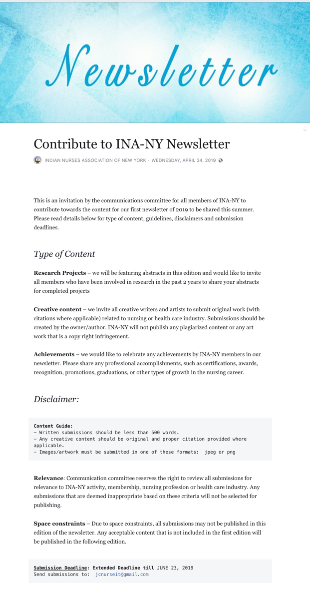 INANY would like to invite all members to contribute to the newsletter. Please review the criteria below for details. Contact us at https://www.facebook.com/INAnewyork/ for any questions.